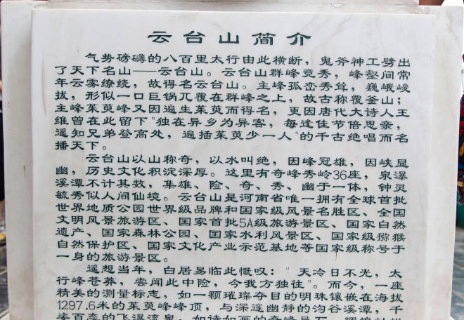 在云台山,员工们先后游览了泉瀑峡、潭瀑峡、猕猴谷、叠彩洞、药王洞、茱萸峰、万善寺、峰林峡、青龙峡、百家岩、红石峡、子房湖等主要景点。云台山整个景区山峦连绵不断,尤其是主峰茱萸峰海拔1297.6米,登上茱萸峰顶,北望太行深处,群山层峦叠嶂,南望怀川平原,沃野千里、黄河如带。青山绿水令人心旷神怡,陶醉其中。